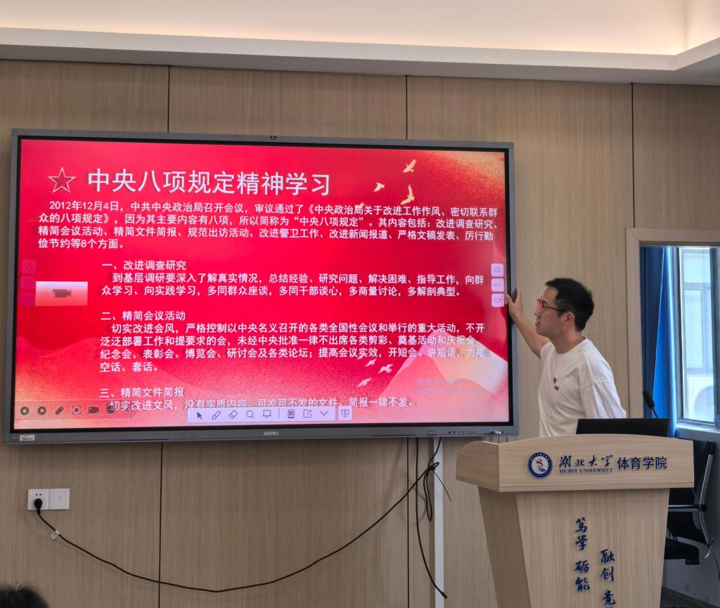 全体党员重温入党誓词、共同学习党章部分章节后,2022级研究生党支部组织委员陈浩带领全体党员开展专题理论学习,开展深入贯彻中央八项规定精神学习教育,深入解读中央八项规定精神内涵,并结合典型案例强化纪律意识。