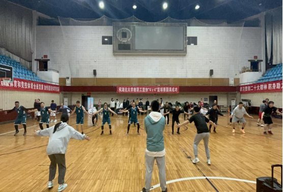 支部篮球专项志愿者带领参赛老师们进行赛前篮球专项热身活动,尽可能降低运动损伤的风险,同时让老师们以更好的竞技状态投入到比赛当中。