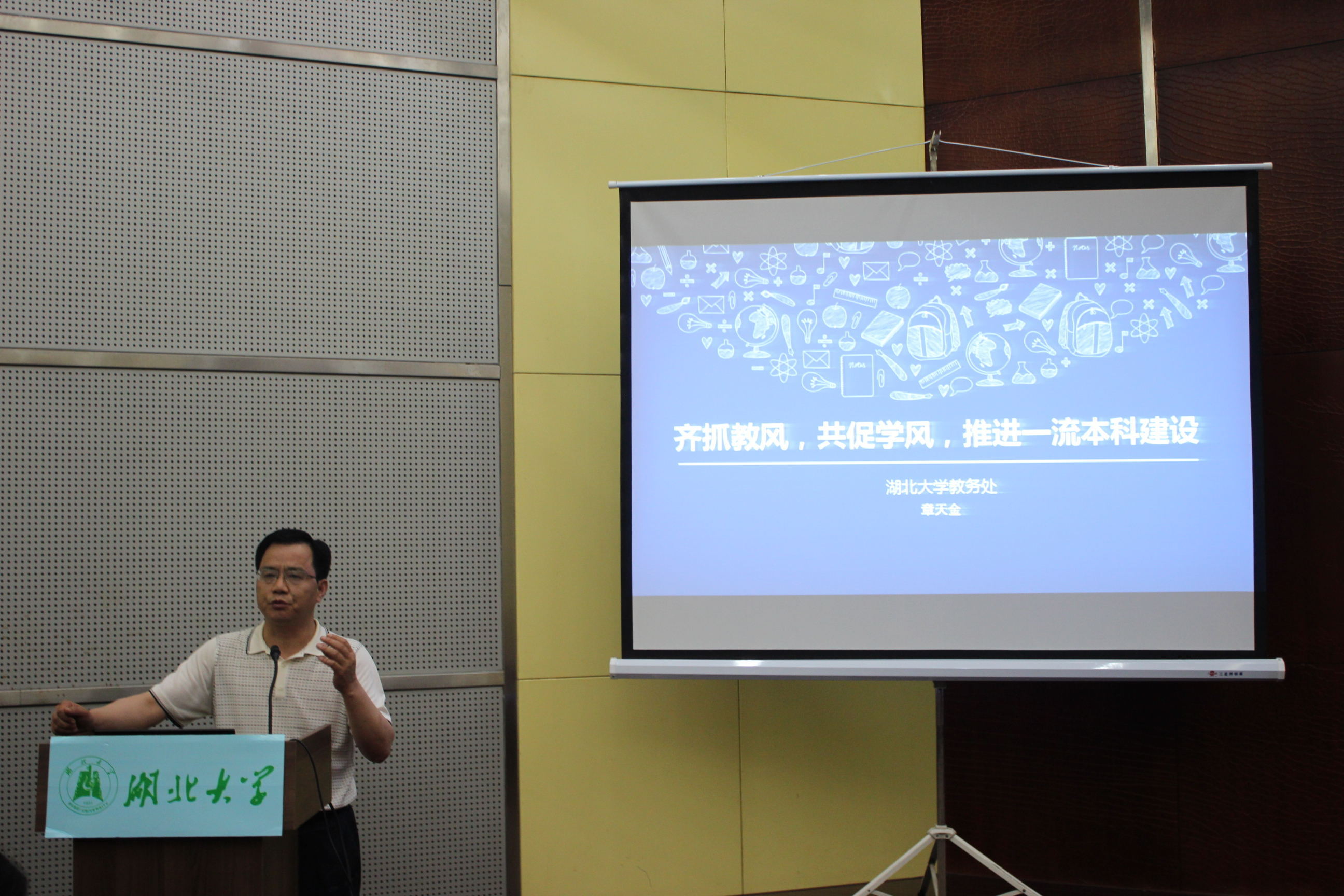 教务处处长章天金从学校建设一流本科教育的角度,同师生们交流了齐抓教风、共促学风的一些想法。具体从一流本科建设的若干理念、推进一流本科建设的思路、教风学风建设的若干思考三个方面介绍了教务处即将进 行的一系列教学改革。章处长对英国365上市集团的教风学风建设工作给与了高度评价,他认为,英国365上市集团教师研究教学、热爱学生,英国365上市集团班子重视教风学风建设,他相信,在班子、教师、学生的共同努力下,英国365上市集团一定会创建学校一流的教风学风环境。