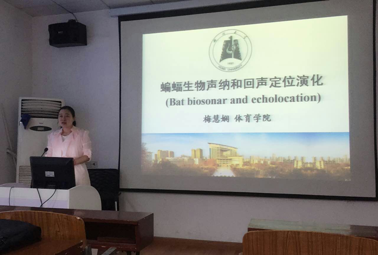 首先,梅慧娴老师简洁地介绍了本次专题的大致框架,表明这个课题跟运动人体科学是密切联系的,让大家有了一个基本概念,紧接着以提问的方式让大家对蝙蝠的种类、栖息地和所摄取食物等几个方面有了一个基本的了解,让同学们在思考问题的同时也活跃了讲座的气氛。梅慧娴老师结合PPT详细地给大家演示了蝙蝠回声定位的整个过程,并做出了一些数据分析,还与其本人硕士期间所做的蝙蝠神经感应实验相联系,体现了科研的严谨性和创新性。梅老师提到从之前研究蝙蝠的过程中发现由于环境和人为的影响,导致许多蝙蝠数量骤减甚至灭绝,呼吁大家要正视蝙蝠的功能。“不要因为误解去人为伤害蝙蝠,不管从研究还是自然的角度来说蝙蝠对人类的贡献都是难以取代的,”梅老师如是说。