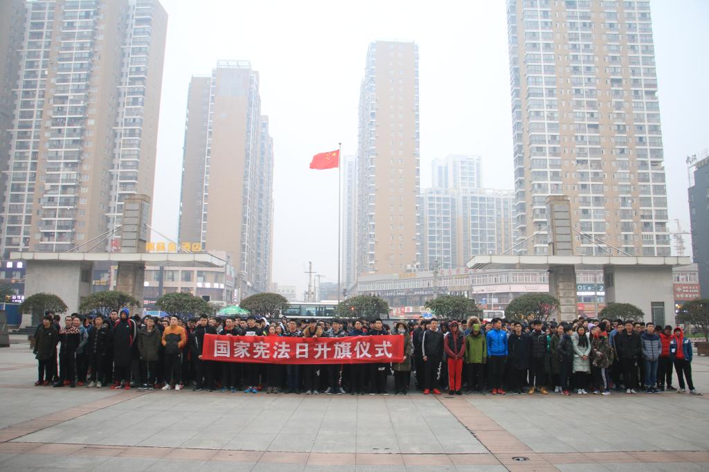 早上6:50,学生们在我校行政楼门前集合完毕。7点,升旗仪式正式开始。国歌奏响时,全体学生面向国旗行注目礼,并大声齐唱国歌。在庄严肃穆的国歌中,国旗缓缓升到国旗顶端,在朝霞中飘扬。升旗仪式结束后,周淑老师发表了国旗下讲话,他表示:“世界宪法日旨在进一步提高全民的法律素质和全社会法治化管理水平,当代青年应响应号召,提高自身法律素质,来带动社会法治化管理的进程。”