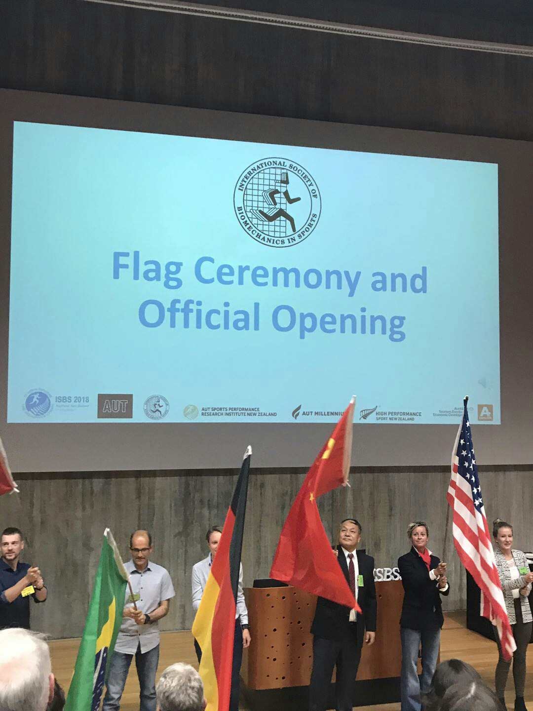 本次会议创新设立了设了生物力学教师日的活动(另文报道)和会议代表国旗入场仪式(图4)。会议期间,李树屏教授还看望了运动人体科学系08级本科学生,奥克兰大学生物工程研究所博士生梅齐昌校友(另文报道)。