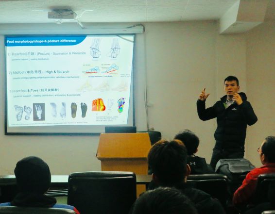 梅齐昌校友的讲座内容丰富,且信息量大。在谈到为什么选择生物力学专业方向,做有关足踝关节的研究时,他详细的说起自己因两次考研失利(达到国家线,未达到北体大校线),受到本科毕业论文导师李树屏教授的帮助与推荐,调剂到宁波大学攻读运动生物力学方向的研究生。其间在为学生上足球课时,观察到外国留学生喜欢裸足运动,且足大趾区域异于国内学生,同时还通过对农村老年妇女“三寸金莲”缠足的细致观察,探索出足骨在全缠和半缠中的功能适应,由此引发他在专业领域一系列的思考,并将思考付诸于实践探索,将研究成果在国内外重要学术期刊《体育科学》、《Journal of Sports Science》等发表。