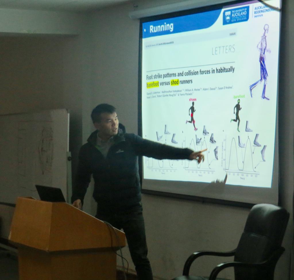 梅齐昌校友从一篇《nature》论文“足与双足的适应”引入讲座的主题。而后,较详细的展示了其在从硕士到博士研究生学习期间关于对人体足的形态、跑步的生物力学、功能鞋的生物力学、羽毛球蹬跨步的力学分析、不同提踵高度下大强度动作的生物力学分析、跖趾关节形变模型、骨在缠足中的功能适应、基于人群计算肌肉骨骼模型方法等方面研究成果。