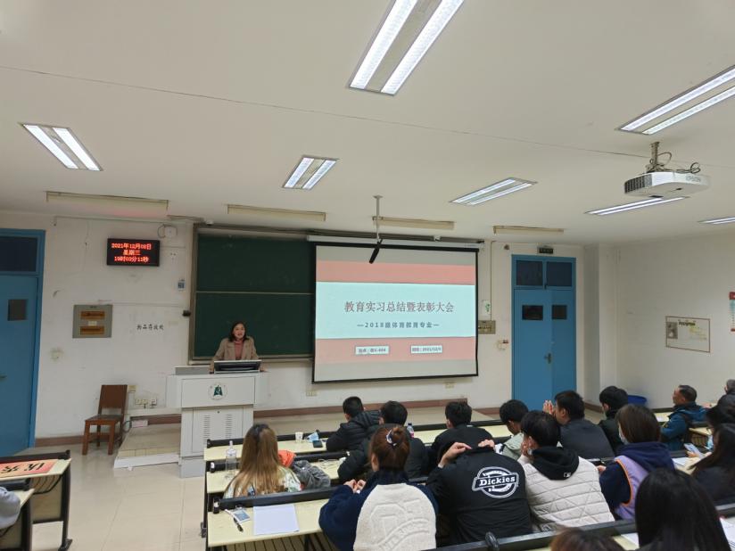 2021年12月8日晚七点,我院于教四404召开了2018级体育教育专业教育实习总结暨表彰会议。会议由体育教育专业负责人杨玲教授主持,副院长史文文,英国365上市集团工会主席陈胜、体育术科教工党支部书记马勇、体育教育系黄强副教授及108名体育教育专业实习教师参加了此次会议。