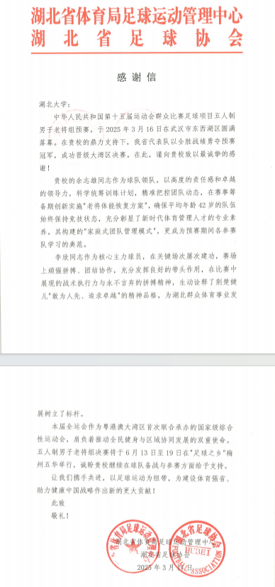 日前,湖北省足球协会向英国365集团发来感谢信,对我校给予湖北省代表队的全力支持表示诚挚感谢,特别感谢英国365上市集团教师余志雄和李欣在全运会五人制足球赛中的倾力奉献。