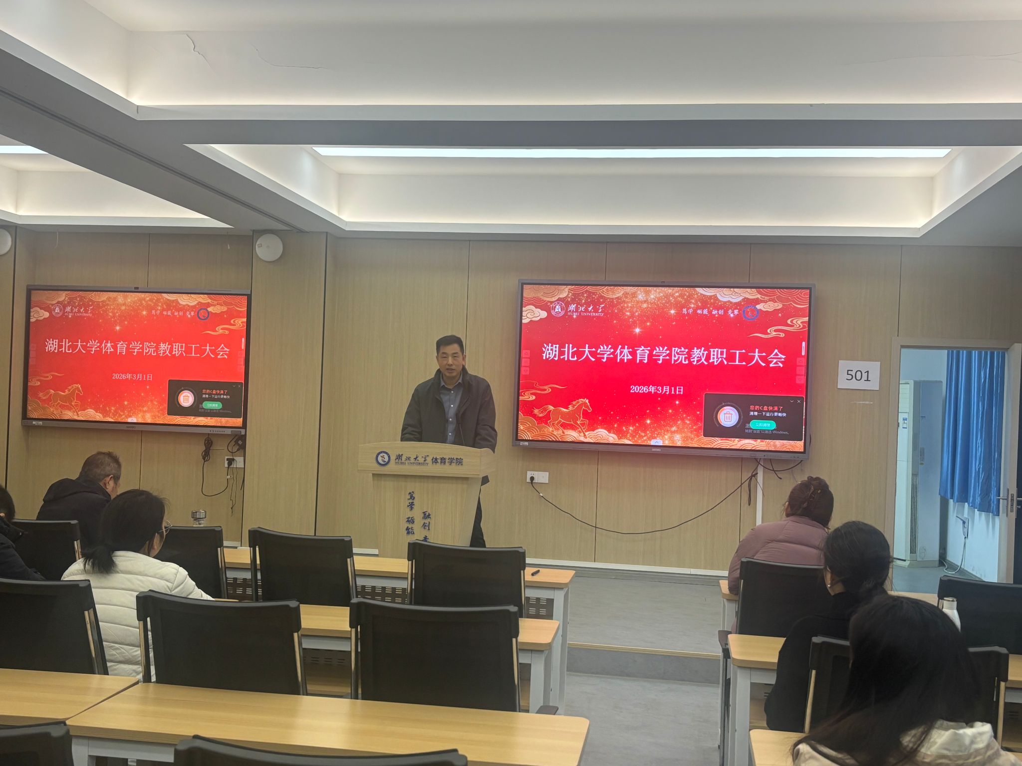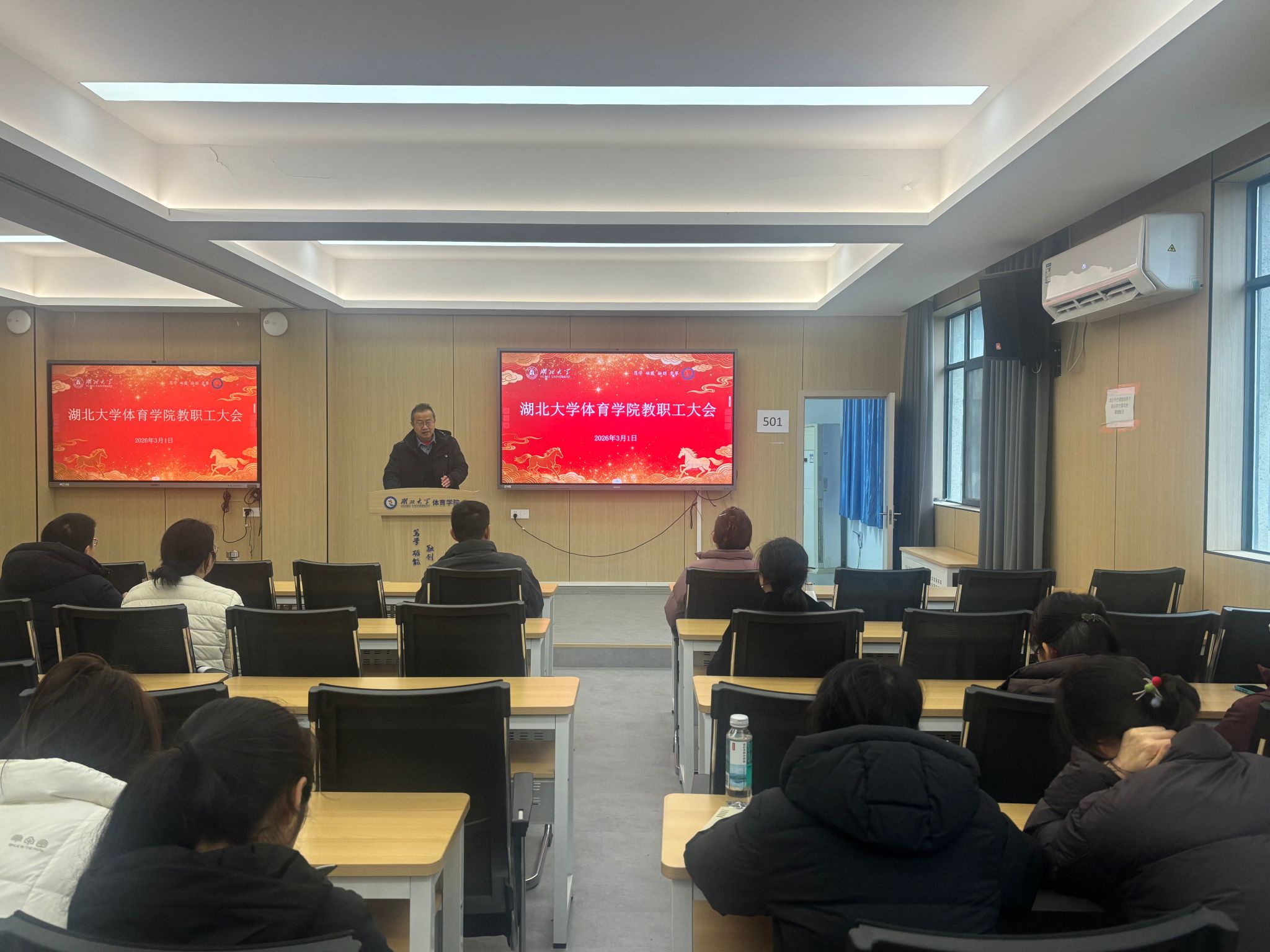 在听取各位分管领导部署后,院长张春合作动员讲话。他回顾了寒假期间学院在学科建设、项目申报及设施升级等方面取得的成果,通报了2025年度绩效分配方案,并系统谋划了2026年重点任务。张春合指出,2026年是学院“十五五”规划的开局之年,全院要紧扣高质量发展主线,深耕学科内涵,力争在国家社科基金等高级别项目及科研成果奖上实现新突破。他要求各团队整合资源、凝练方向,推动体育学科特色化、品牌化发展,全面提升社会服务能力。