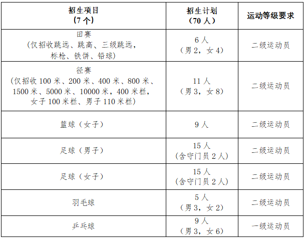 2.我校体育专项成绩录取控制线:径赛80分,田赛75分,篮球(女子)70分,足球(男子)80分,足球(女子)非守门员70分,足球(女子)守门员65分,乒乓球68分,羽毛球60分。