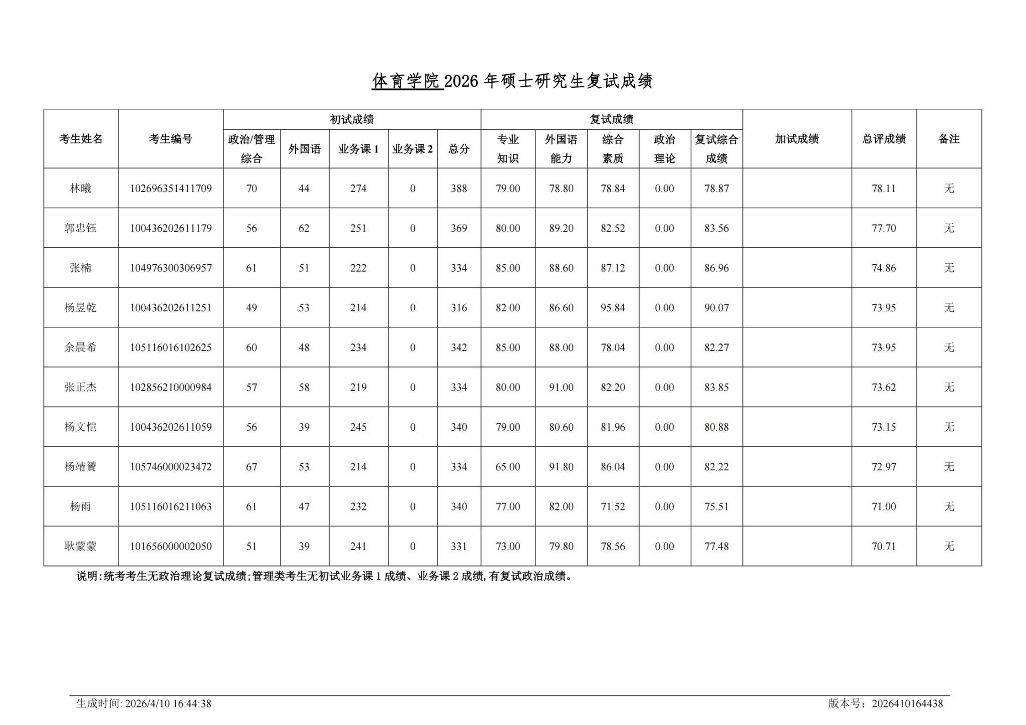 英国365上市集团2026年硕士研究生复试成绩(调剂)